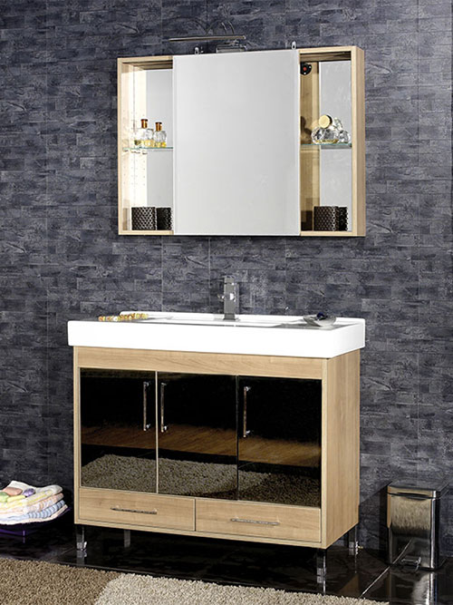 Το μοντέρνο έπιπλο μπάνιου ROBEN 100 είναι προϊόν MDF με επένδυση καπλαμά Δρυ. Αποτελείται από μία βάση, η οποία περιλαμβάνει τρεις (3) πόρτες με μαύρο τζάμι από μπροστά, καθώς και δύο (2) μικρά συρτάρια κάτω από τις πόρτες. Η σύνθεση περιλαμβάνει, ακόμα, έναν (1) επικαθήμενο πορσελάνινο νιπτήρα και έναν (1) καθρέπτη με συρόμενη πόρτα.